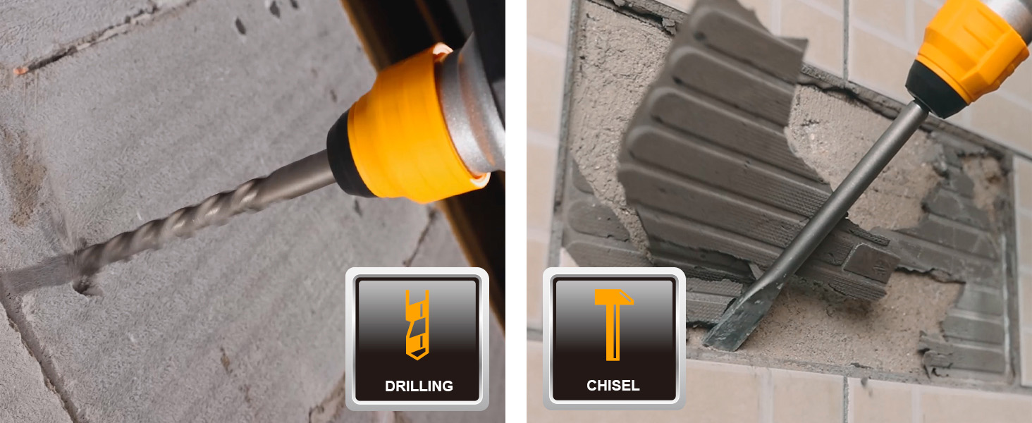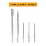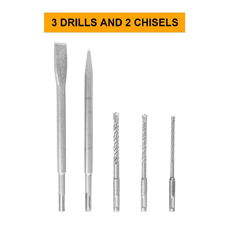 Complete set includes: 3 drills, 2 chisels, and 1 set of extra carbon brushes